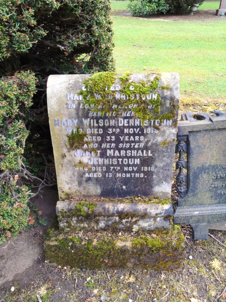 Mary Wilson Dennistoun (nee McIntyre) lies in Camelon Cemetery, Falkirk. The headstone was erected by her daughter. Mary succumbed to complications from influenza on the 3rd of November 1918 aged 33. Her death occurred during the second and most lethal wave of Spanish flu. She died at Laurel Bank in the nearby town of Bonnybridge. She was married to railway brakesman William.