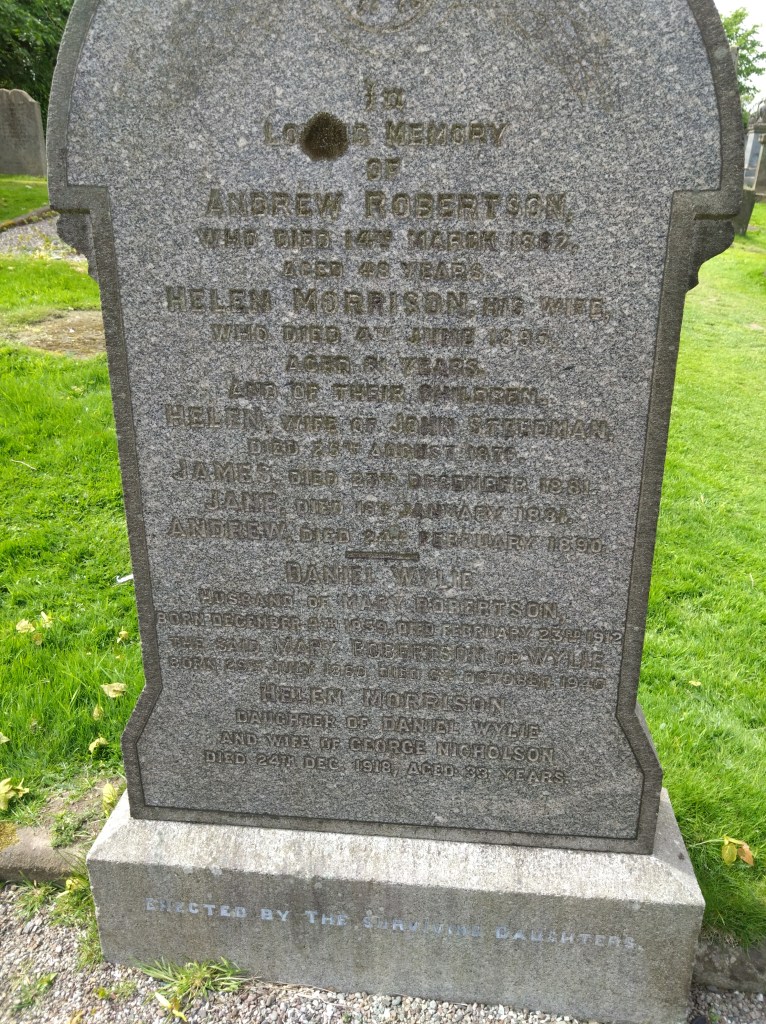 Helen (nee Wylie) lies in Old Town Cemetery, very close to the tower of the Church of the Holy Rude. Her grave is among the first you encounter should you enter the cemetery next to the church’s main entrance, and former Cowan Hospital. She shared her resting place with, what I believe to be her maternal grandparents, and her father who predeceased her in 1912. Her mother was laid to rest with her family in 1940.
