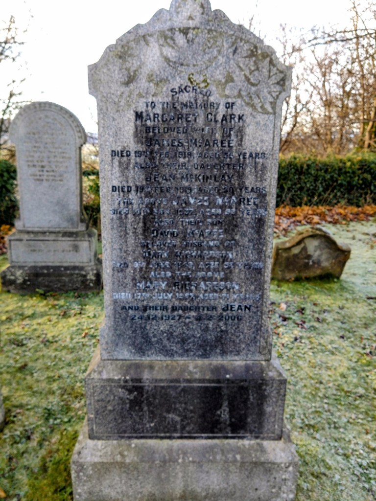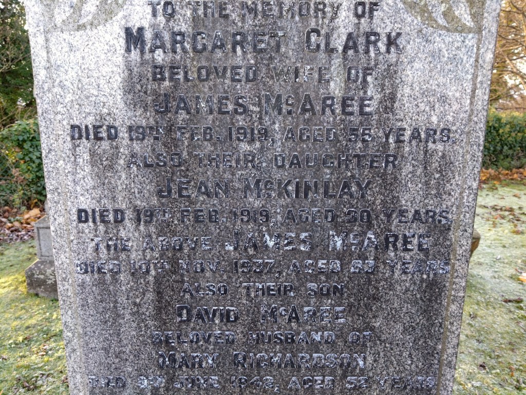 Margaret Clark and and her daughter Jean McKinlay McAree lie in a familial grave, both dying on the 13th of February 1919. Margaret succumbed to complications two days after contracting influenza at home aged fifty-five. Hours later Jean died in Stirling Royal Infirmary. aged thirty, pneumonia was recorded as the cause of death. It cannot be proved, but there is a likely probability that this was caused by influenza.