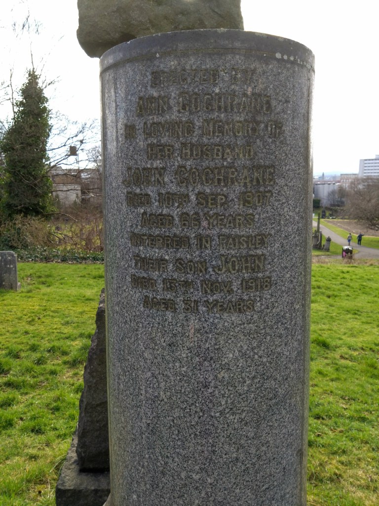 John died on the 13th of November 1918 from influenza and pneumonia at Woodilee Asylum in Lenzie, East Dunbartonshire aged thirty-one. He rests in the Segundus section of Glasgow Necropolis. His grave is marked by an unusual column headstone.