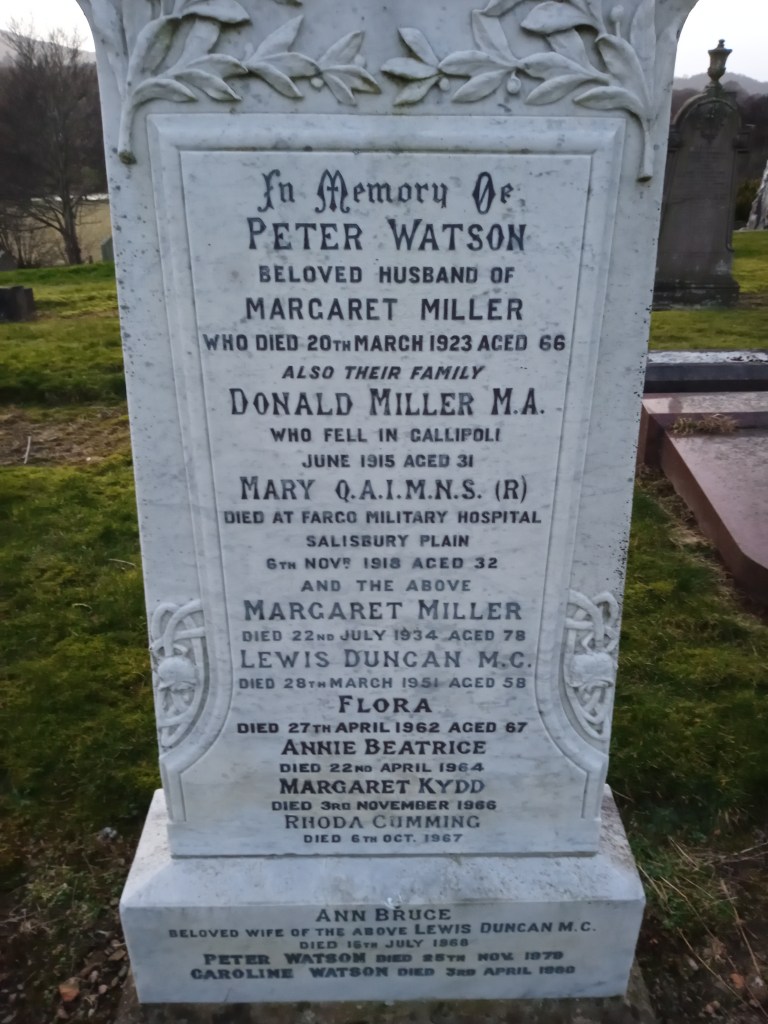 Mary is commemorated alongside Jessie McRobbie on the Crieff War Memorial. Donald’s name is on the memorial too.