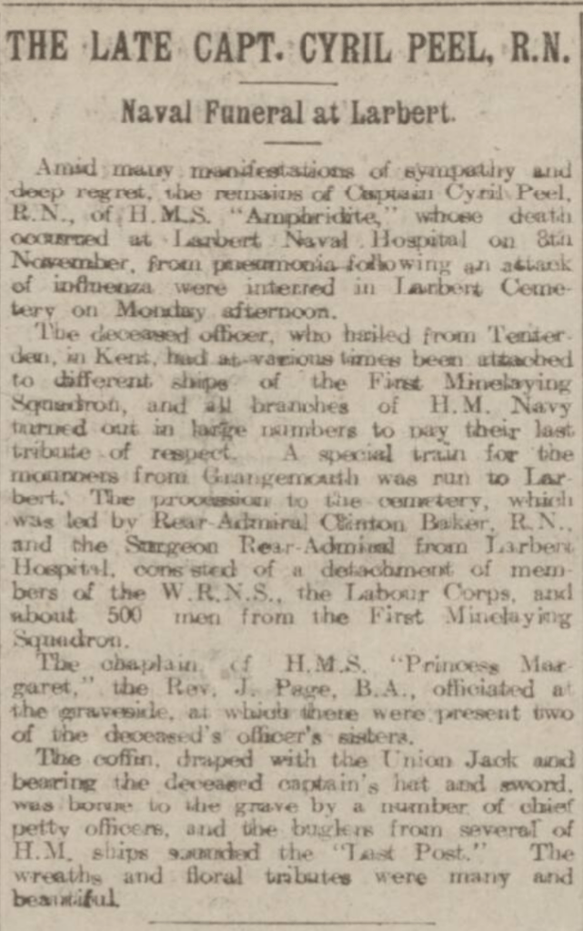 Cyril was afforded a military funeral in Larbert Cemetery, which was well attended, a special train between Grangemouth and Larbert was run to allow fellow mariners to attend. His hat and sword rested atop his flag draped coffin.