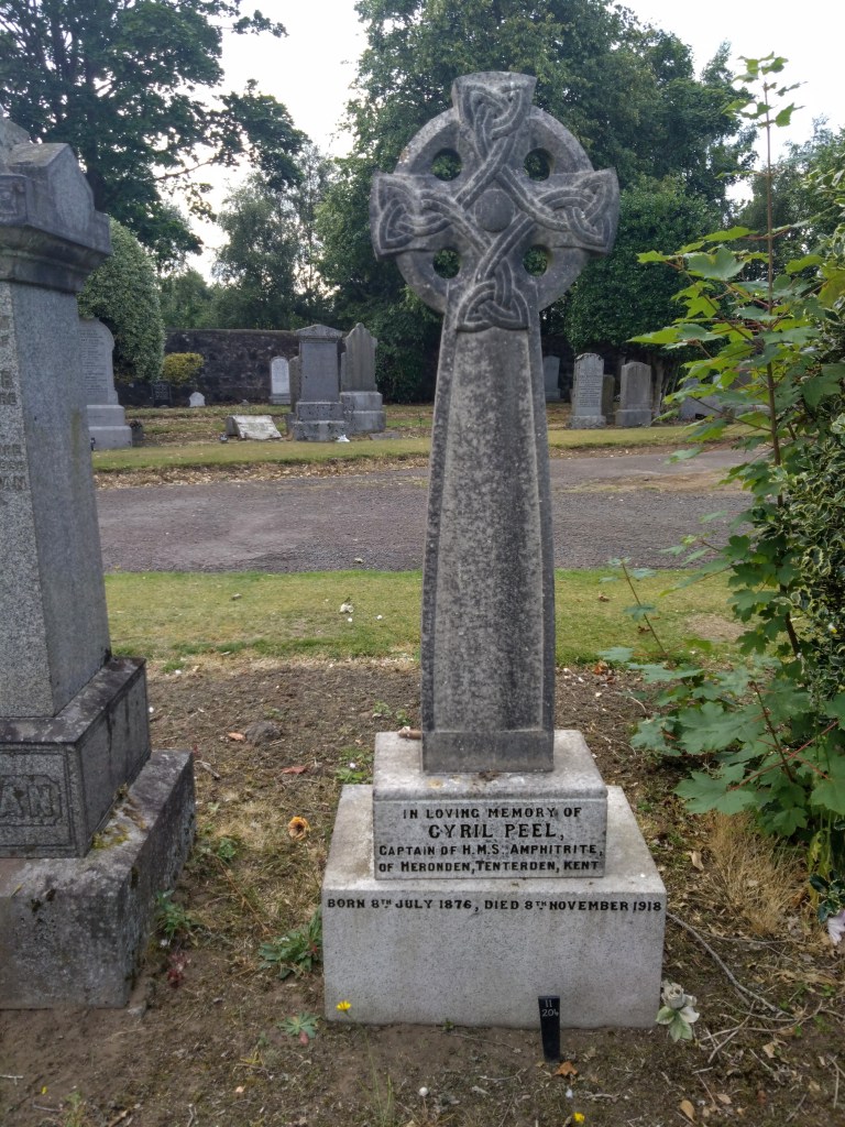 Today I paid my first visit to Larbert Cemetery in Stenhousemuir to the east of Falkirk. Among the graves I found was that of Cyril Peel Captain of HMS Amphitrite. The headstone is an elegant Celtic cross in excellent condition, likely cared for by the Commonwealth War Grave Commission.
