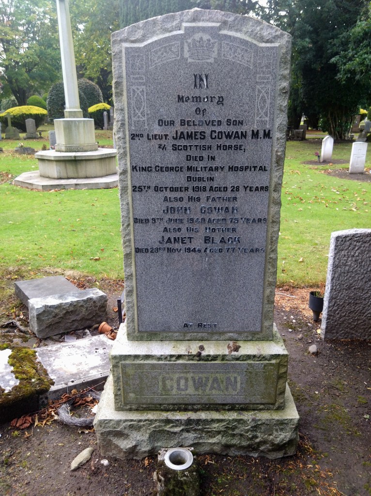 James died on October 28 at the King George Military Hospital in Dublin aged twenty-eight. His death was attributed to pneumonia following influenza. He lies in Section 11 of Camelon Cemetery. His resting place is not marked by a Commonwealth War Grave Commission (CWGC) headstone, though the former likely care for the grave.