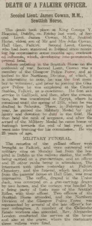 James joined the Scottish Horses following the outbreak of war. According to the Falkirk Herald on November 2, he was the first in his police division to volunteer. He would reach the rank of Sergeant. He served in Gallipoli before being transferred to Egypt, Macedonia and eventually to Salonica, Greece, in 1916. In February 1917, he was awarded the Military Medal. After receiving his commission, he was sent to Ireland, where he fell victim to the Spanish flu pandemic. In correspondence with his parents after his death, the chaplain to the Scottish Horses Brigade, the Reverend J Reid Christie spoke of his “shock of surprise and grief” that James would survive harsh conflict only to succumb to disease in Ireland.