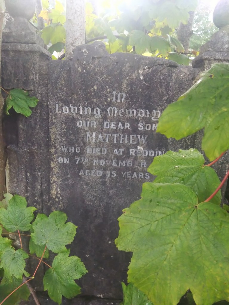 Matthew’s grave is situated in Polmont Old Parish Church Cemetery. It is found near an adjacent field maple tree, which obscures the headstone. Matthew passed away at his home, Parkview, in the nearby village of Redding, on November 7, 1918, from “acute pneumonia and influenza.”
