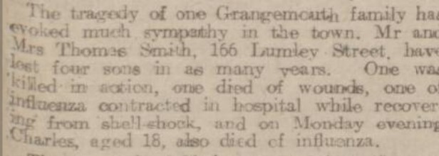 The memorial for Janet Smith and her sons may seem unremarkable at first glance, but it holds a profound significance that is easy to overlook. Thomas and Janet Smith lost four sons: one was killed in action, one died of wounds, and two died of Spanish flu. On Saturday, November 30th, the Falkirk Herald recognized this loss and expressed sympathy from the community. John died from influenza and pneumonia on October 31st in Seaford, Lewes, East Sussex, whilst recovering from ‘shell shock’ at age twenty-five. Whilst he is commemorated on the familial memorial, he rests in Seaford Cemetery. His grave is marked with an official CWGC headstone. Charles succumbed to “influenza, bronchitis and pneumonia” on November 25th at 166 Lumley Street, Grangemouth, aged eighteen.
