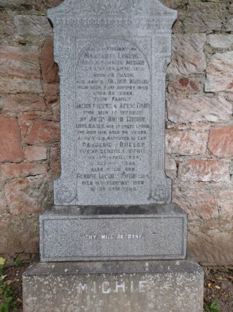 Alva Cemetery is nestled on a picturesque hillside at the eastern periphery of the town, offering serene views of the surrounding landscape. While Dr. John Michie’s final resting place is not within Alva Cemetery, he is honoured and remembered on a family headstone against the northern perimeter wall. This heartfelt tribute is a testament to his enduring legacy within the community. John passed away on December 31st in Arkhangelsk, North-West Russia, at the age of 38, where he was laid to rest in the Archangel Allied Cemetery. I was unable to find any indication of the cause of his death. Nonetheless, given his age and date of death, it is highly probable that influenza was the cause.