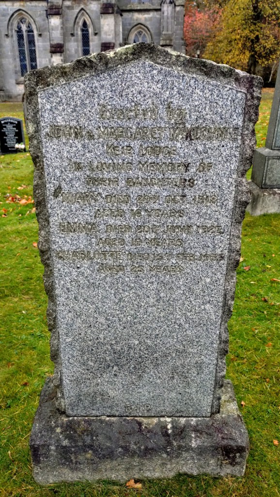 I couldn’t find an obituary for Mary, but I can only imagine the immense heartache that John and Margaret must have felt after losing their daughter at such a tender age. Their sorrow didn’t end there, as they tragically lost two more daughters in the years that followed. Emma’s passing on June 17, 1927, due to phthisis (pulmonary tuberculosis) at just 19 years old, must have been another devastating blow. Then, their youngest daughter, Charlotte, died at Stirling Royal Infirmary on February 15, 1937, at the age of 25. It’s heartbreaking to think of the family’s losses, and both Emma and Charlotte were laid to rest with Mary in Lecropt Churchyard, together in their eternal peace.