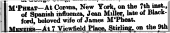 The situations in Corona, located in the New York borough of Queens, and Blackford in South Perthshire, are quite different. However, there is a small yet significant connection through a name on a headstone in Blackford Churchyard. Jane McPheat, also known as Jeanie, passed away on Halloween in Corona at the age of thirty-six. Her obituary, published in the Strathearn Herald on November 16, explicitly noted Spanish influenza as the cause of her death. The headstone with her name is situated against the western perimeter wall of the Churchyard. It is in good condition and still legible. I am unsure whether her remains were repatriated to Scotland and now rest in Blackford.