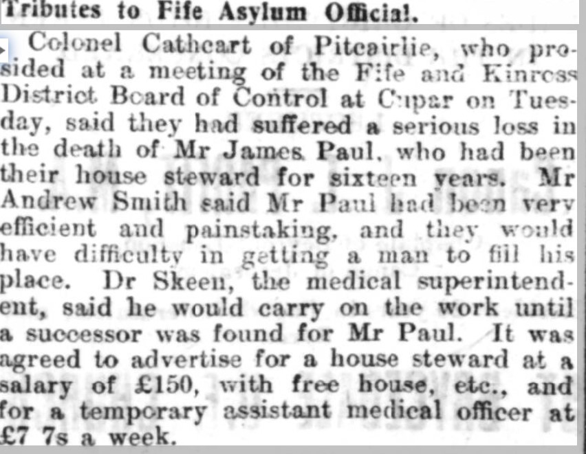 Shortly after his marriage, James underwent a significant career change when the Fife and Kinross Lunacy Board appointed him house steward at Statheden Mental Asylum in Cupar. He would serve in this role for sixteen years. At the 1911 Census, the Paul family resided on-site with him.