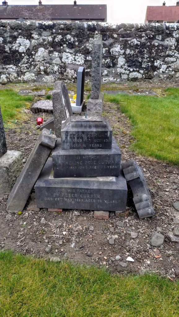 Tullibody Churchyard dates back to the 12th Century, and the remains of the church date back to the 16th Century. The site is adjacent to relatively modern social housing, which is an interesting juxtaposition. Looking westward, Abbey Craig and the Wallace Monument are on the horizon. The new cemetery sits adjacent to the original site and is the resting place of Peter Curran. Peter died of pneumonia following a week-long battle with influenza on October 23 at 5 Woodside Tullibody, aged sixteen. Whilst still legible, the headstone is in poor condition.