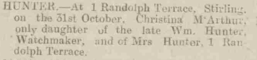 Christina McArthur Hunter was born on May 10th 1890, at 21 Wallace Street, Stirling, to William, a watchmaker, Cambuskenneth native, and Jeanie (nee Muirhead). She was the couple’s fifth child and first daughter. The family resided at 21 Wallace Street when the Census was taken the following year. They employed a live-in servant, suggesting they were a relatively affluent family.