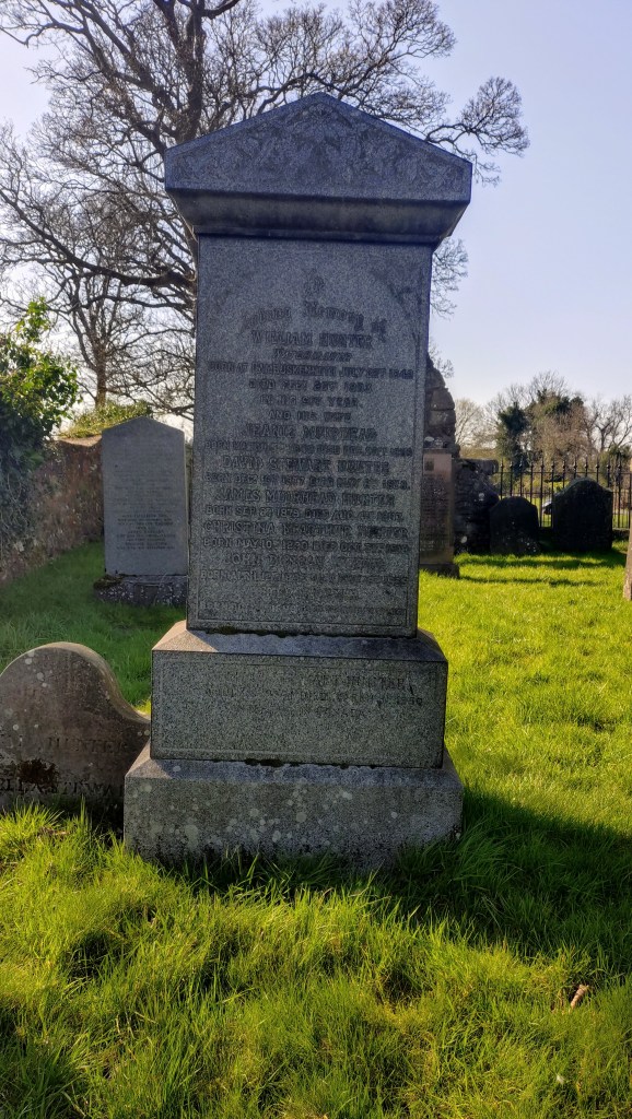 Cambuskenneth Abbey dates back to the reign of David I of Scotland in the 12th century. Besides the tower, there are few visible remains of the once-grand Abbey. The most famous burial at the site is James III and Margaret of Denmark; their grave is marked by an impressive monument. In comparison, the grave of Christina McArthur Hunter is unremarkable in the extreme. The headstone is one of roughly a dozen memorials that sit south of the tower in a miniature cemetery enclosed by an iron fence. The remains of an original archway from the Abbey serve as the entrance. The Hunter family headstone sits at the eastern edge of the burial ground and is visible through the fence. Christina died on Halloween at 1 Randolph Terrace, Stirling, aged twenty-eight. She had battled influenza for ten days and pneumonia for four.