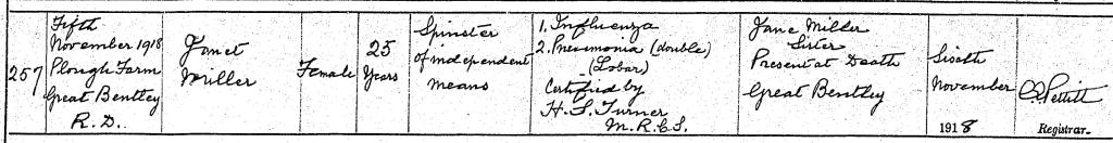 Sadly, William and Janet lost their father, Thomas, in 1911, aged sixty. He was interred in Denny Cemetery. I was unable to locate Janet precisely on the 1911 Census. She may still have resided in Renfrewshire, by which time she would have been seventeen. Her elder sister Jane was present at her death, suggesting that Janet died in her home, where she was either a temporary visitor or a permanent resident. Her death registration cites her as a “spinster of independent means.“ Her remains were not repatriated to Scotland but were interred in the Churchyard of St Mary the Virgin in Great Bentley. The location of her burial suggests that Great Bentley may have been her permanent home. Alternatively, her family may not have had the money to transport her body to Scotland, or perhaps local public health guidelines promoted swift disposal of an influenza victim’s remains.