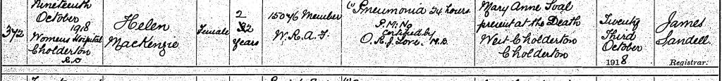 Old Monklands Cemetery is situated on the outskirts of Coatbridge, on a south-facing hillside with impressive views towards nearby Bellshill, Uddingston, Rutherglen and the eastern fringe of Glasgow. The peace is disturbed only by the rush of traffic from the neighbouring M8 Motorway, Scotland’s busiest road. Helen MacKenzie, the only child of Donald and Annie MacKenzie (a fact confirmed on her headstone), rests in the Cemetery. The body of the headstone has separated from the base, but is in reasonable condition otherwise. It is in the care of the Commonwealth War Graves Commission. She died of pneumonia on October 19th 1918, at the Cholderton Women’s Hospital, Amesbury, Wiltshire, aged twenty (twenty-two on her death registration). Considering her age and the date of her death, it is likely that the fatal pneumonia followed a bout of Spanish influenza.