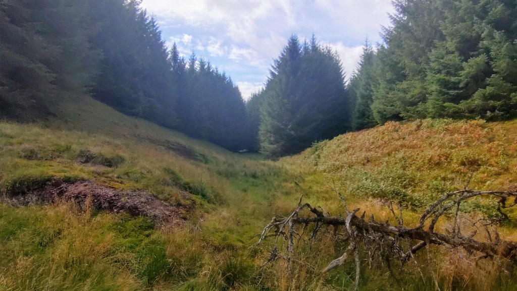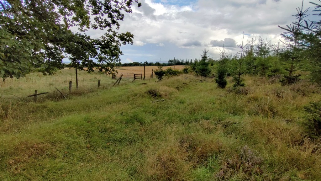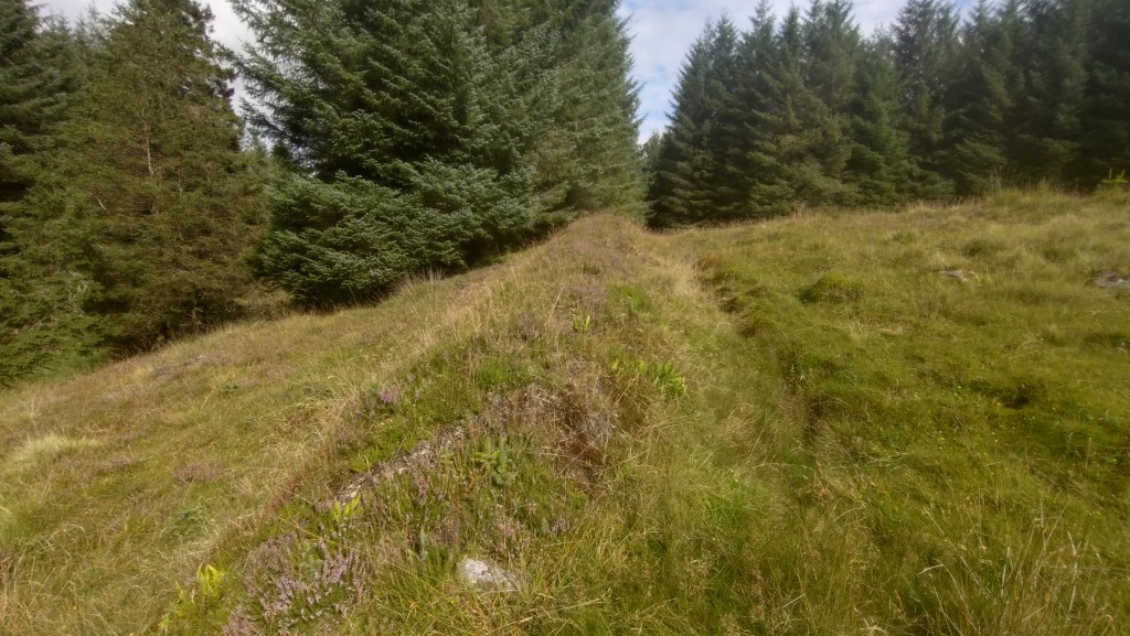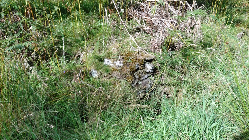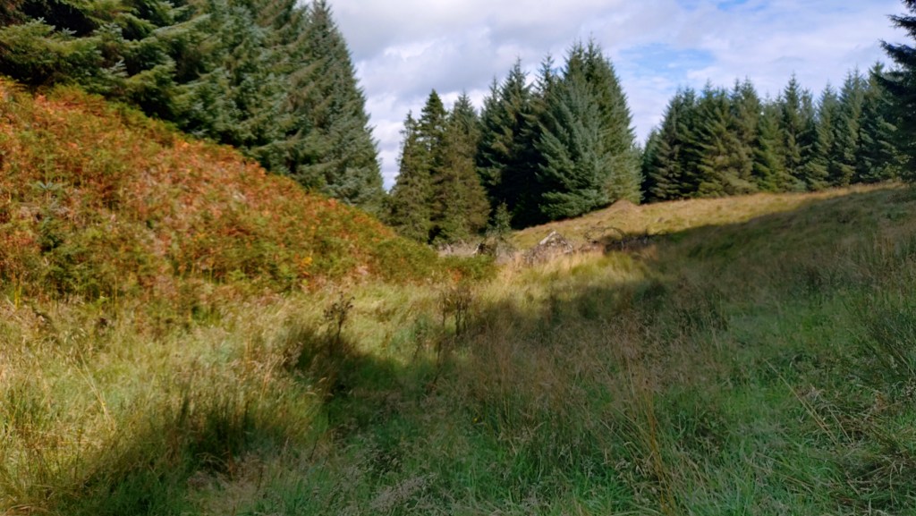 Dougal was a local doctor who took his own life in 1837. He was supposedly buried where he had completed suicide – if true, this is a testament that the exclusion of suicide victims from consecrated ground persisted despite the 1823 legislation. His grave was marked with a cairn; over the years, locals added stones. According to PastMap, the cairn is located north-east of the Suicide Graves, within what is presently the Forestry Commission’s Muirhead Plantation. There are no longer any paths or tracks, and the ground between the trees is choked with bracken and heather, making it impossible to determine the cairn’s exact location. Whilst exploring the area, I felt what appeared to be a loose pile of stones underfoot, obscured by vegetation. There is no way to determine if this is a random group of rocks or the remains of Dougal’s Cairn. As the area has been enveloped by commercial forestry, the practice of adding stones was abandoned many years ago, and likely before the Forestry Commission became the custodian of the land. In addition, I encountered what may be further remnants of the parish boundary. It is not improbable to suggest that the Suicide Graves could be in the Muirend Plantation.