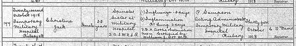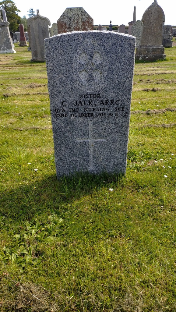 Thurso Cemetery is among the most northern on the UK mainland. The cemetery is located on the southern outskirts of the town. Thurso native Christina Jack died from influenza and inflammation of the lungs on October 22, aged thirty-five, at the Birmingham War Hospital in Rednal, where she served as a nursing sister. Her body was repatriated to Thurso and marked with a Commonwealth War Graves Commission headstone.
