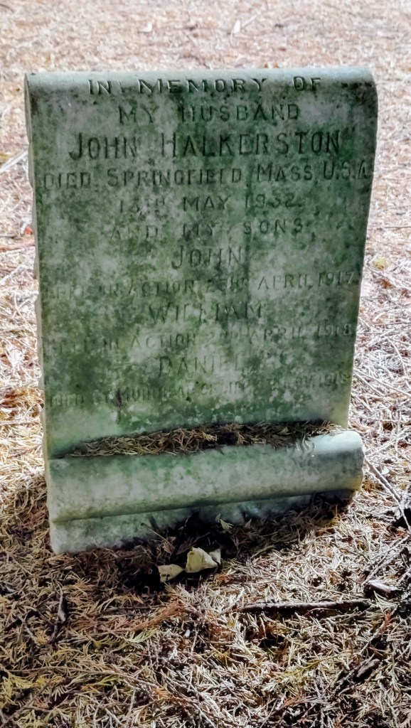 In 1923, John and Mary emigrated to the USA, departing from Liverpool on October 23 and sailing to New York on the Cunard Line’s Carmania. After arriving, they travelled north to Boston, Massachusetts. They would later settle in Springfield, Hampden County, where they remained for the rest of their lives. John died on May 13 1932, aged sixty-six. Mary survived him by two years, dying on July 2, 1934. Both were interred in Oak Grove Cemetery. The headstone in Liff, marking the resting place of Daniel and immortalising John Jr and William, was commissioned and erected after John Sr’s death.