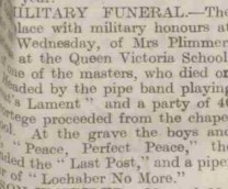 Alice’s funeral took place in Dunblane on Wednesday, October 23, two days after her death. Following a service in the school chapel—the official memorial to Queen Victoria in Scotland—her coffin was escorted by the school’s pipe band and a cortege of forty to St. Mary’s Church.