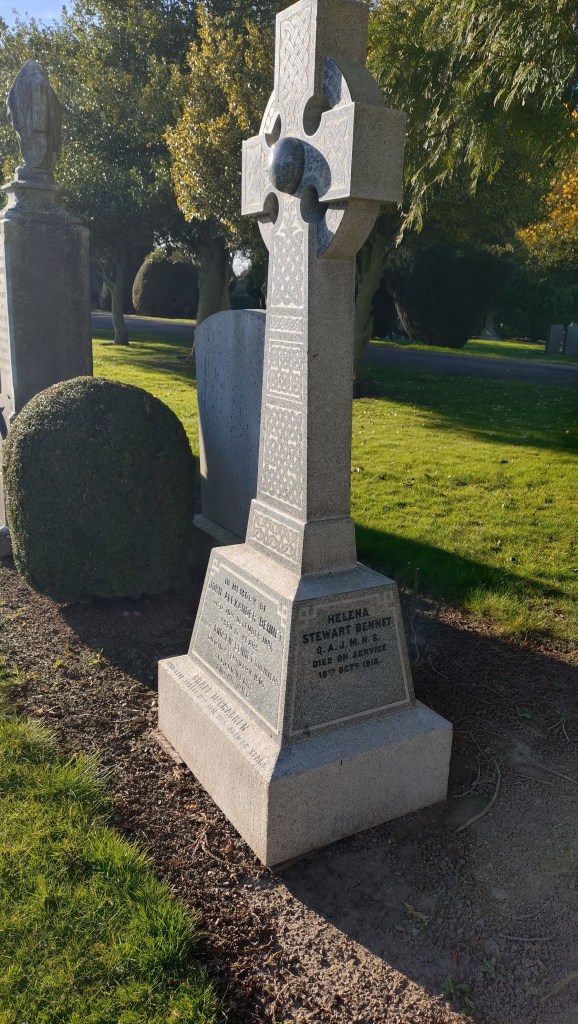 Inspired by the outbreak of war or perhaps by her sister Constance, who had qualified as a physician, Helena commenced her nursing training at Edinburgh Royal Infirmary. After four years of training, she qualified and joined the Queen Alexandra’s Imperial Military Nursing Service (QAIMNS). Her decision to join QAIMNS caused significant anxiety for her family. Still, they felt relieved when she was assigned to the Prisoner of War Hospital in Oswestry instead of being sent to France – a sad irony given that she may have avoided catching influenza and ultimately survived. Sadly, just eighteen days after enrolling in QAIMNS, Helena passed away. She was buried alongside her father and brother on October 21.