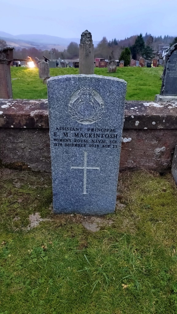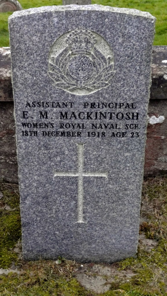 The grave of Evelyn Mary Mackintosh is one of two Commonwealth War Graves in Daviot Churchyard. Evelyn Mackintosh, Assistant Principal in the Women’s Royal Naval Service (WRNS), died on December 18 at 82 Campden Hill Court, Kensington, of heart failure after a five-day battle with pneumonia caused by influenza. She was twenty-three years old. Marked with a standard CWGC headstone, she rests beside her family in a small walled-off area next to the eastern wall of the church.