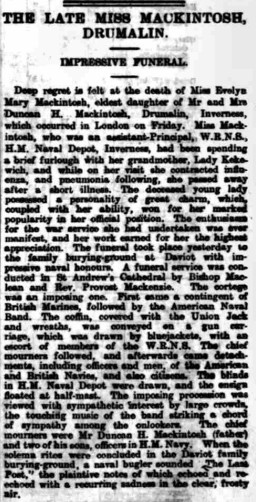 Evelyn died during a furlough during which she was paying a visit to her maternal grandmother, Lady Kevevich, with her family. Her father was present at her death. Her remains were repatriated to Inverness-shire. The funeral took place on Christmas Eve. She was afforded military honours. After a service in St. Andrew’s Cathedral, Inverness, a gun carriage bore her flag-draped coffin through Inverness to Daviot Churchyard, where she was laid to rest.