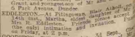 Martha’s obituary was published in the Dundee Courier on Thursday, October 17th. Her funeral took place on the following Friday.